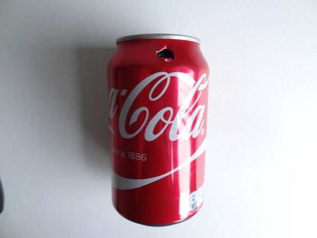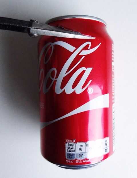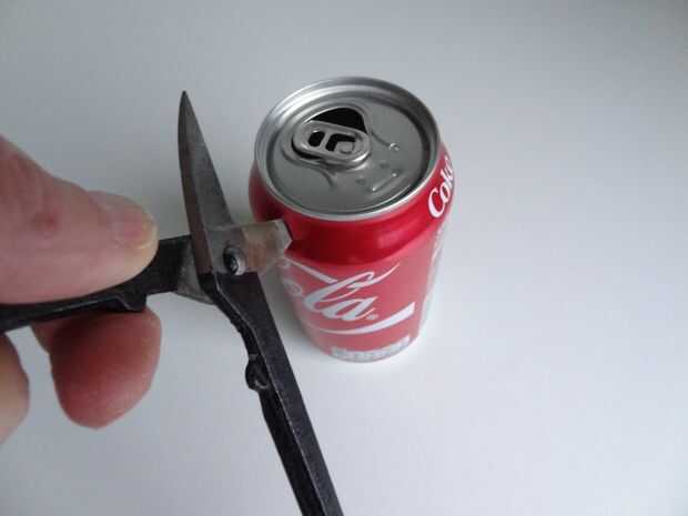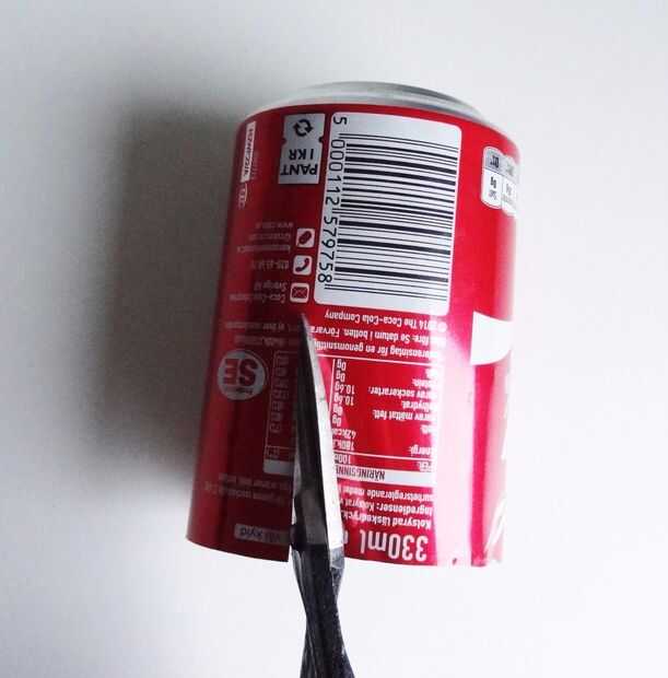 Empezar a hacer un agujero en su poder presionando el punto de sus tijeras en la parte superior de su poder (ver primera foto). Dar sus tijeras un giro y abrir el agujero un poco más. (También puede utilizar un abrelatas de poder de corte de lado a quitar primero la parte superior) Corte alrededor de eliminar el "hombro" de la can. Por favor tenga cuidado con los bordes agudos, puede cortarse fácilmente. Ahora corta en la parte inferior de la lata y asegúrese de que mantener intacto el logo. Quitar la parte inferior.