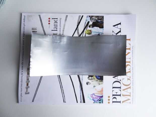El metal es muy rizado, así que siempre intento acoplar antes de empezar a trabajar con él. Hacerlo de esta manera: tome un extremo del metal en una mano y el otro extremo en la otra mano. Aplanar ligeramente el metal por la curva en sentido contrario o en el borde de la mesa. Esto ayudará a aplanar. Poner su chapa en el diario.