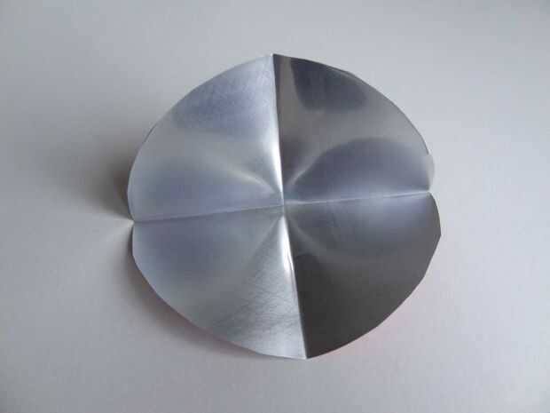 Doblar el círculo en el centro y presione suavemente en la línea de plegado, si se presiona demasiado duro en los pliegues que el metal se rompe. Abrir el círculo y dóblalo de la manera opuesta. Abrirlo de nuevo, el círculo se divide en cuatro partes.