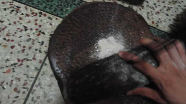 1 en el primero moler las cáscaras de huevo en polvo con el mortero. Puede secar la cáscara de huevo en el sol o en el horno para molerlos fácilmente en polvo.