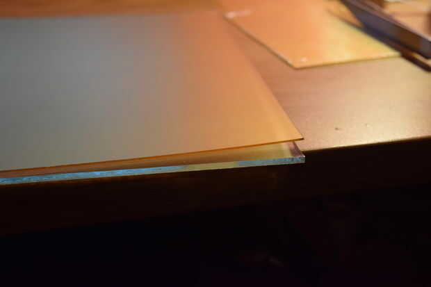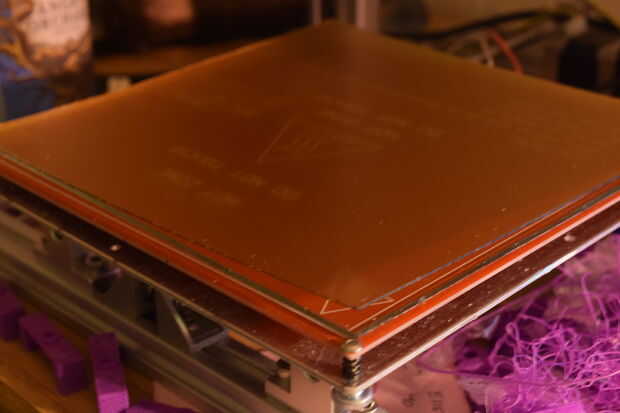 Retire el plástico en el lado opuesto (para mí, el lado brillante) y coloque su PEI encima de la cama de cristal grabado (estar seguro de que el vidrio se limpia y libre de residuos) tal que el lado deseado es en la parte superior. Luego con cuidado retire el plástico de ese lado.