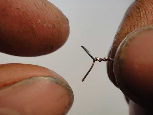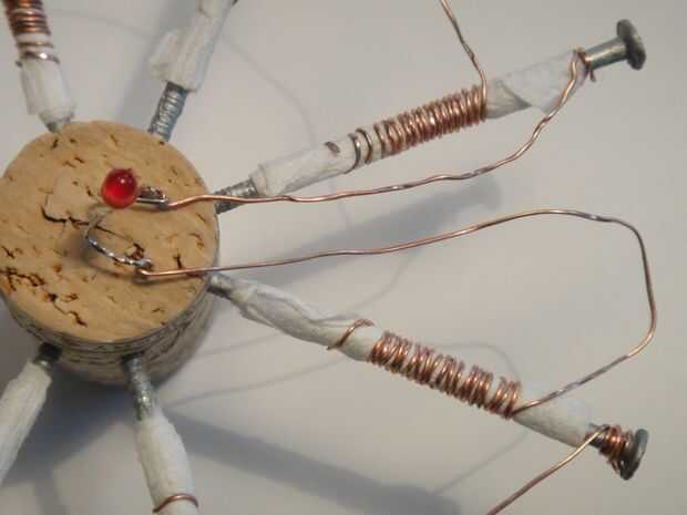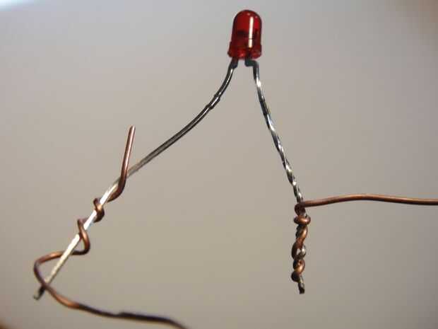 Gire una 2" longitud de alambre de cobre alrededor de plomo negativo del LED y envuelva el otro extremo alrededor de la cabeza del clavo restante (que es la conexión negativa de la batería).