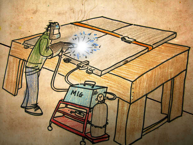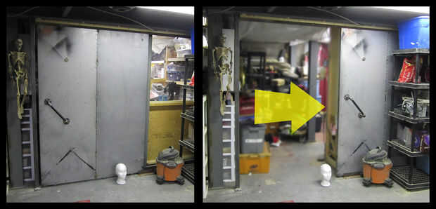 Decidimos que necesitábamos una habitación libre de polvo en nuestra tienda para que mi pareja Tina podría hacer el raro poco robots y monstruos y cosas que ella hace sin serrín todo ellos. Estoy en el proceso de creación de un espacio para ella ahora (todavía repleta de cajas pero me estoy poniendo allí) y tuve un montón de viejos de metal puertas así que yo intentaría hacer una puerta corredera, algo que sólo un científico loco quisiera para su laboratorio. Estas puertas de metal son grandes - tengo una docena de ellos apilados en un rincón - uso para taller de estanterías y mesas y todo tipo de cosas!