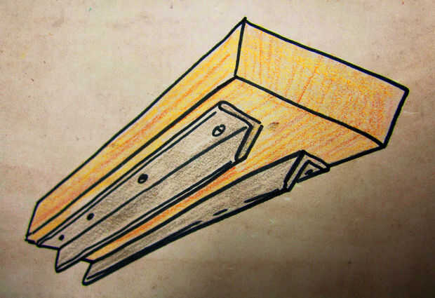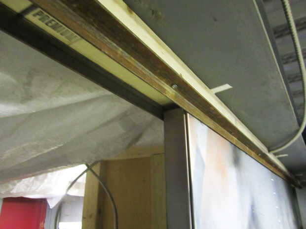 Para hacer el canal a lo largo del techo había atornillado a pedazos de hierro viejo de ángulo en 2 x 4 y había montado todo el asunto a un aéreo i-beam. Creo que tuve acerca de 3/16 de pulgada entre la parte superior de la puerta.