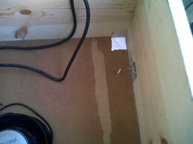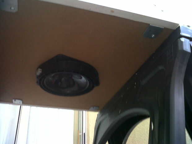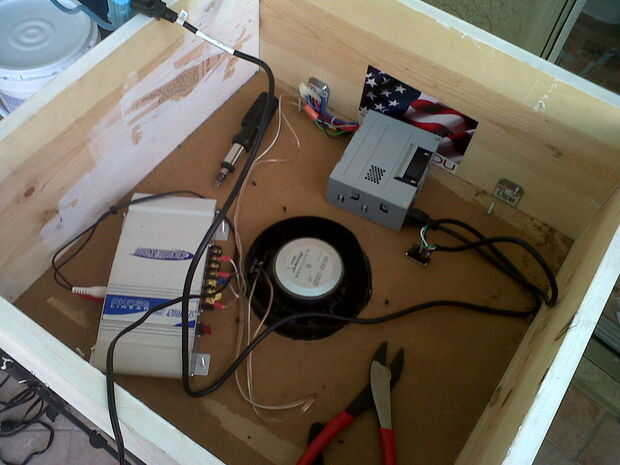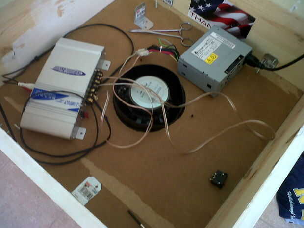 Ahora fui por delante y había pegado a los altavoces con el amplificador y fuente de alimentación en. Los orificios perforados y había enroscada el amplificador, me decidido a pegamento caliente el poder de la fuente hacia abajo más tarde.