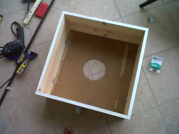 Por supuesto pongo el fondo en, utilicé los soportes de metal L que acabo de encontrar en Lowes y pensé que funcionaría (probablemente no para esto, pero bueno que trabajaron)