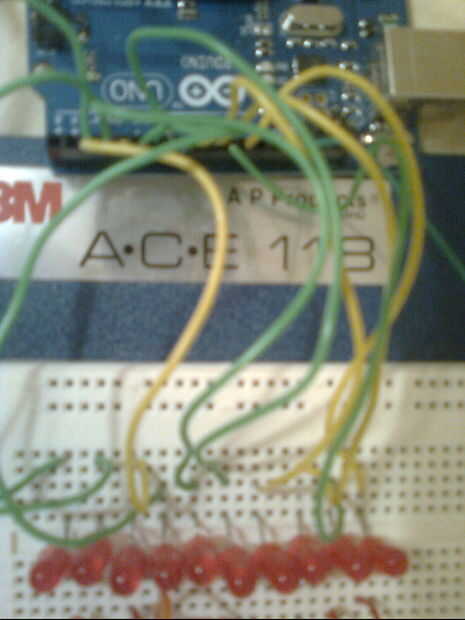 Ejecutar un solo cable entre los cables de positivo de cada LED para Arduino.  Utiliza los puertos digitales de 2 a 11 (en el lado con el puerto USB).  Alambre de los LEDs en orden 2 a 11, así que 2 es el primer LED y 11 es la última, que es el LED 10.
