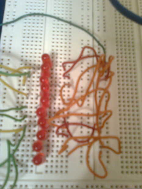 Cada LED debe conectarse a tierra a Arduino.  Pase los cables del cable en cortocircuito, de tierra de cada LED de un puerto de tierra en el Arduino.  Tuve que saltar de muchas diversas filas en el protoboard para conseguir los 10 para ir al mismo puerto de tierra.  Puede ayudar la imagen de mi configuración, pero mi propia configuración no es limpio.
