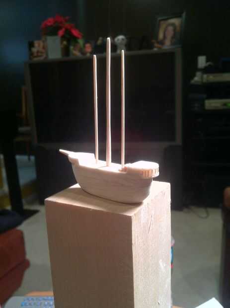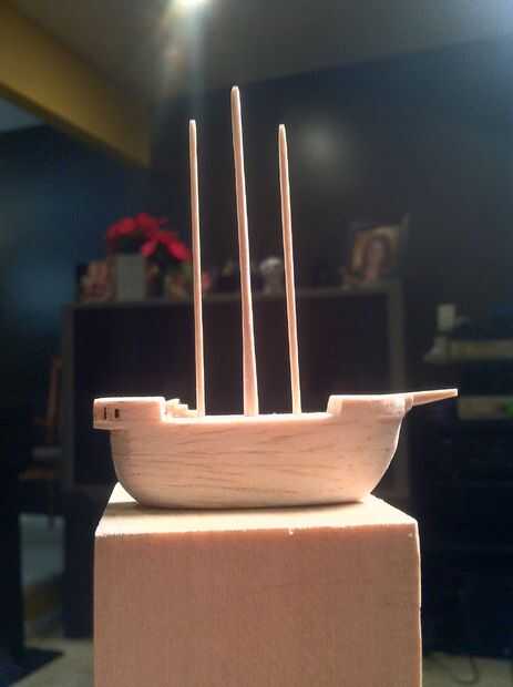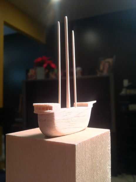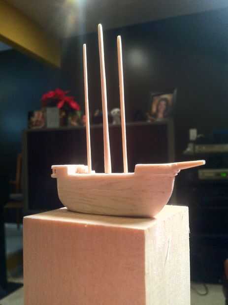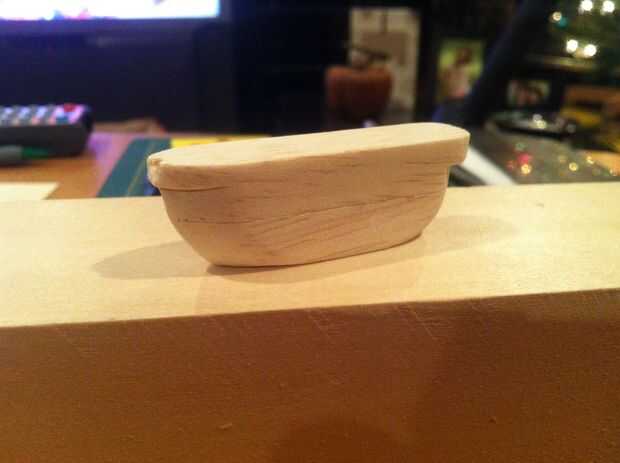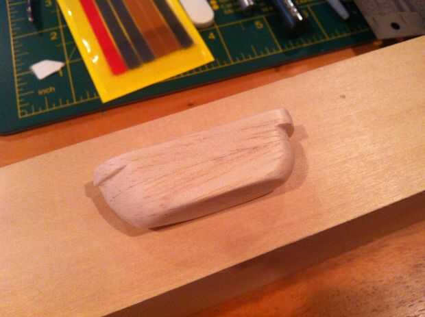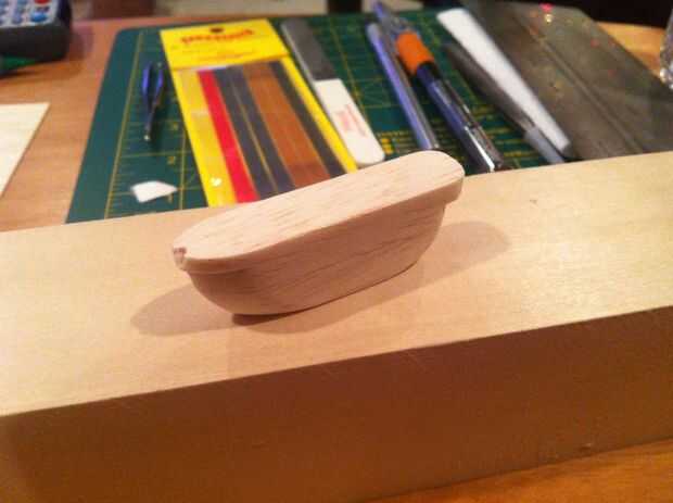 Comenzar con un cuchillo fino x-acto para cortar la forma áspera del casco, de 2 piezas de madera bajos pegados juntos. Entonces arena para crear una forma más última del casco sí mismo. Se corta la cubierta hacia fuera hacia fuera para crear un levantado proa y la popa.