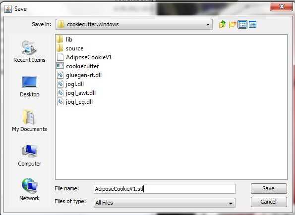 Continuación tendrá exportar diseño del cortador de galleta en un formato que puede imprimir en una impresora 3d, un archivo STL (lenguaje estándar de la teselación, que describe la geometría de la superficie de las tres dimensiones de la forma, no hay textura, color etc., ver http://en.wikipedia.org/wiki/STL _(file_format)
