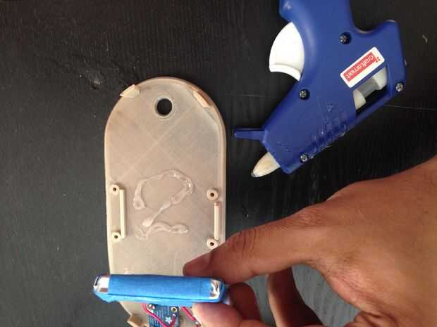Agregue el modificador y pegamento caliente la batería a la parte de la base, añadir cinta de la batería al protector seguro la batería.