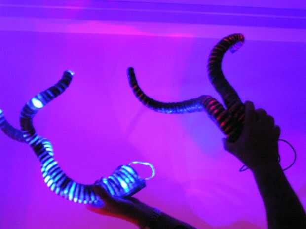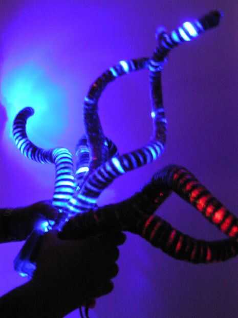 - 2 sistemas de luces. He utilizado cuerdas 20 pilas rojo o azul, 'arroz' de luces de Navidad. También vienen en color verde. Cuestan casi nada si tiempo derecho y hacer que justo después de Navidad. El único inconveniente a las luces del arroz es que una vez que están dentro de los cuernos, no es que sale. También se utiliza un alambre EL o resplandor. Cuesta mucho más, y no es tan brillante; pero obtener un brillo más uniforme. Y, a diferencia de las luces de arroz, el alambre del resplandor es fácil sacar los cuernos.