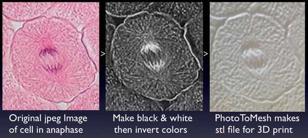 Si usted desea utilizar su propio archivo de imagen jpeg, deberás ajustar el patrón de color, usando un programa como Adobe Photoshop. PhotoToMesh colores blancos o más claros mayores sobre el eje z de sube y baja colores negro o más oscuros en el eje z del archivo stl producidos para impresión 3D. El gráfico muestra un ejemplo de cómo puede hacerse una imagen original a la izquierda y negro y color invertido para producir una imagen (imagen central) donde los cromosomas y la membrana de la célula, por ejemplo, son de color blancos para que la impresión 3D producida a partir de este archivo tendrá los cromosomas y membrana celular planteado más arriba que el de los alrededores. El objetivo, por supuesto, es producir una imagen táctil que por tacto y sensación puede proporcionar información para un estudiante ciego aprender donde se encuentran los cromosomas y la membrana de la célula. La imagen de la derecha muestra la impresión 3D hecha de un archivo stl por PhotoToMesh a partir de la imagen central.