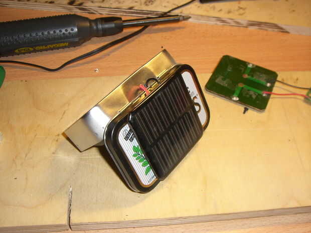 Tienes los cables para el panel solar a través de la tapa de la lata primeradel hilo de rosca. Entonces usted puede jugar con plomo caliente.
