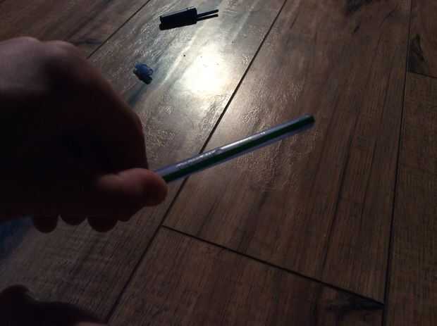 conseguir una pluma BIC y saque la cámara de tinta con pinzas o sus dientes, manos. Hacer un agujero en el centro de la pluma con un cuchillo. Entonces una goma y poner en el lápiz como se muestra en la imagen. Entonces la cámara de tinta a través de