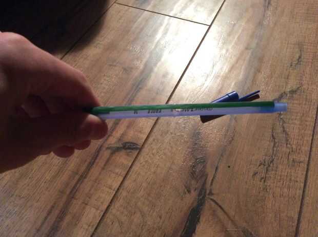 materialesUn bolígrafo BicUna gruesa banda de cauchoAlgo para crear un agujero(Yo usé el cuchillo que tenía en mano)Paso 1: DesmonteDesarmar la pluma y deshacerse de la pequeña tapa negraPaso 2: Crear el agujeroHacer un agujero lo suficientemente gra