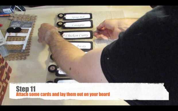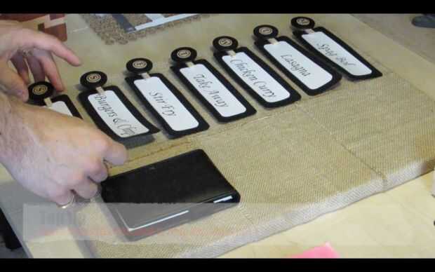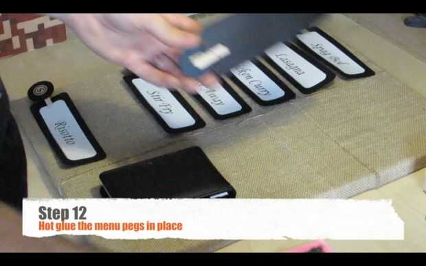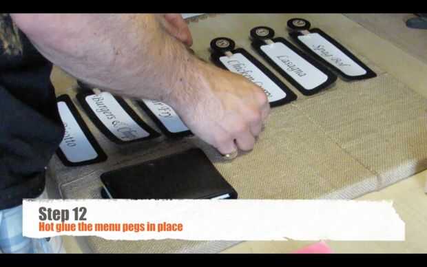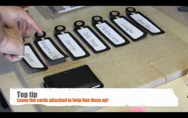 Ahora, hacer tus tarjetas (fui con 12cm de ancho y 3cm de alto) con insertos de papel (escrito hacia fuera e impreso). Si clip una tarjeta de menú en cada clavija, usted puede espacio hacia fuera en el tablero donde usted quiere y sabe que tienes suficiente espacio para ellos!