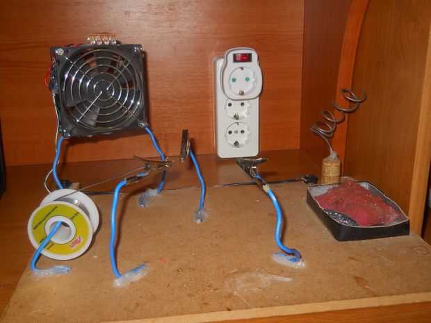 Hace tres años hice esta madera contrachapada basado en estación de soldadura y todavía funciona bien. Casi cada elemento de sujeción está hecha de alambre de cobre muy fuerte, pero es todavía plegable. He creado un extractor de humo con un viejo ventilador de la CPU que funciona con 12 voltios y contiene también 4 LEDs extrabright para asegurar buena luz para trabajar.