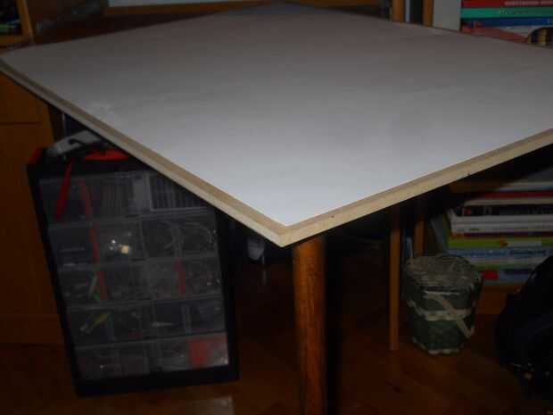 Otra vez debido a la falta de espacio he tenido que encontrar una buena solución para ampliar mi escritorio, porque es muy pequeña sin él. La receta es fácil: usé una tabla de madera contrachapada y dos varillas de madera para hacer un equipo rápido para armar o mesa de trabajo. Lo mejor es que si no uso puede ocultar entre mis muebles y la pared. Al otro lado de la mesa está de pie en el soporte de teclado de mi escritorio.