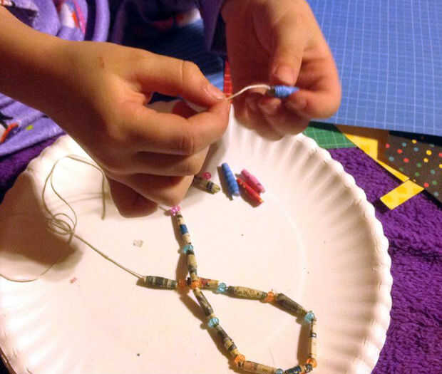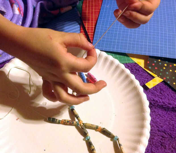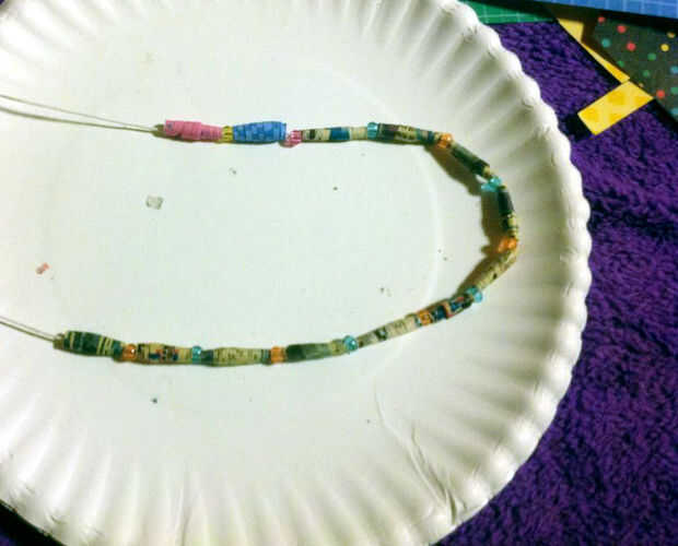 Después de haber creado sus cuentas y les dado un tiempo para secar puede crear su collar. Corte un pedazo de cadena al tamaño que necesita y cadena de sus granos. Puede cadena sólo los granos hacen o se puede tomar algunos otros granos fabricación y colocarlos entre las cuentas de papel como separadores. Las posibilidades son infinitas! Elaboración de feliz!