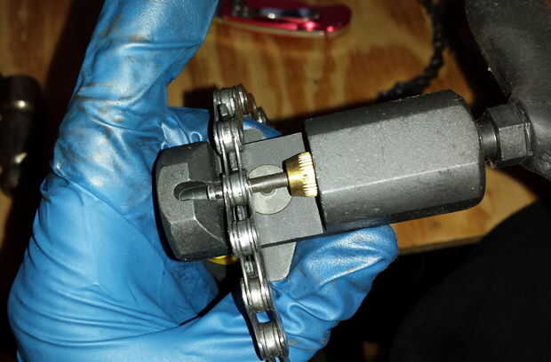 Extraiga el pasador de enlace hasta la cadena interna puede separar, pero por lo que el pin todavía es celebrado por la placa externa. Esto puede ser complicado, pero es más rápido que empujar el pasador completamente hacia fuera y tener que poner el pasador de volver más adelante.