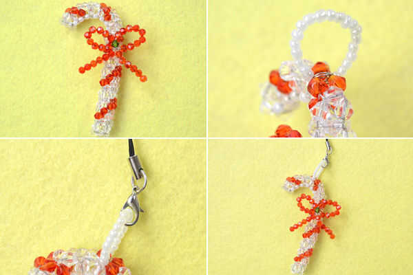 Conectar cuentas arco con el bastón de caramelo con alambre de cobre, luego hacer un lazo con cuentas a candy cane con mostacillas blancas, por fin, conectar un bucle de cuerda negra para el ornamento de caña dulce moldeado.