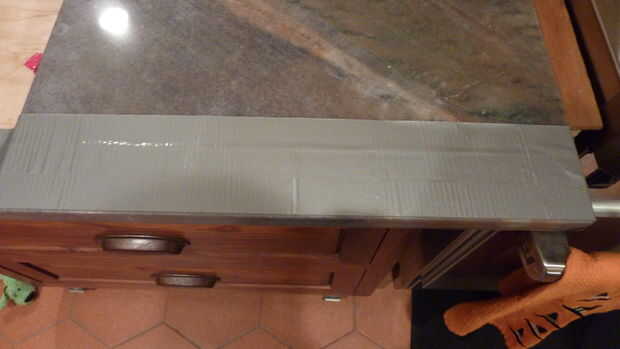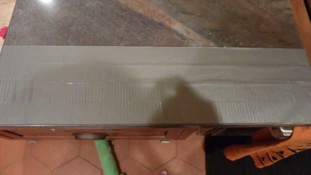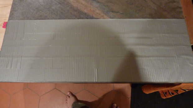 Para empezar, vas a hacer esta cosa llamada "Tela de la cinta del conducto". Utilizar el gris para hacer esto. Elimina la rigidez de todos, pero le da un pedazo de cinta suave, mudable. Empezar por poner un pedazo de cinta adhesiva para conductos, cerca de 16 pulgadas de largo, plana en la superficie de trabajo, el lado pegajoso hacia abajo. Asegúrese de que no hay bolsas de aire ni arrugas para hacer la pieza se vea lleno de baches.
