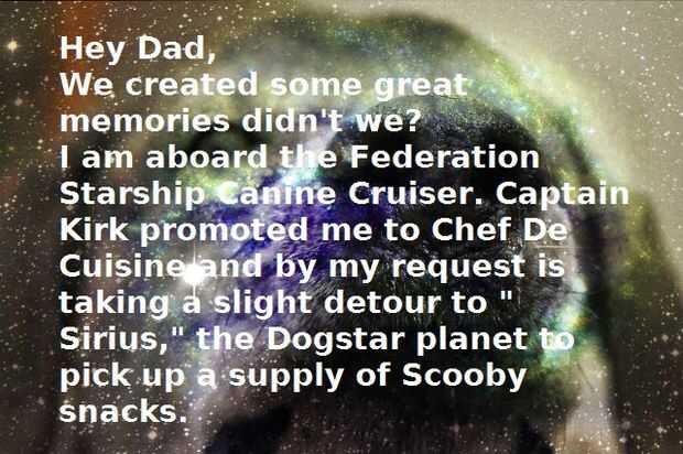 Mi hijo ama cosas tipo Star-trek y espacio, así que me decidí por un tema de espacio para levantar sus espíritus. La primera foto no era claro pero expresión de Scooby fue divertido. Había editado la foto y dibujó una chaqueta para él y el fondo de color y dibujó los globos. Me sorprendió que resultó tan bien como él lo hizo.