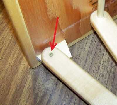 Taladrar un orificio en el extremo de cada uno de dos de las patas de un reaprendizaje de #8.  Los agujeros deben estar en el centro del radio de la utilizan para redondear los extremos superiores de las piernas.  Coloque las patas en el interior de las piezas de sujeción con tornillos de latón.  Las piernas deben montar tan cerca de la parte inferior de la tabla de la bandeja como sea posible.  Coloque una arandela pequeña entre la pierna y la pieza de sujeción.  Usé 1 1/4 pulgadas #8 tornillos de latón de cabeza plana.  Contador se hunden las cabezas por lo que sus tapas queden al ras con la superficie de las piernas.  Ver la flecha roja.