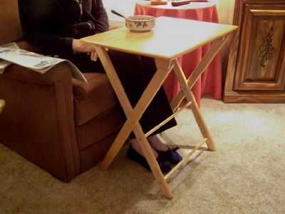 Las piezas de madera de la mesa de la bandeja de TV deben dar un acabado.  Minas fueron barnizadas con rociador de un amigo.  Es importante no dejar que la superficie acabada de laminado recibir cualquier barniz.  Usé cinta de enmascarar y papel para cubrir el laminado, pero no la madera.  Se tomaron las mesas bandeja aparte para barnizar.