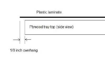 Puede cortar laminados plásticos con cualquier sierra circular. Utilice una hoja con dientes como muchos como sea posible. Corte para que los dientes de la hoja entran en la superficie en lugar de salirlo. Esto es para reducir picar la superficie tanto como sea posible. Cortar piezas de laminado de gran tamaño para por lo menos un alero de 1/8 de pulgada a cada lado de la parte superior de la bandeja. Un poco más que eso le dará protección adicional contra daños a la zona superior de la bandeja acabado de saltar.