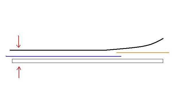 Abrazadera de la lámina a la madera contrachapada donde ves las flechas rojas.  Asegúrese de que hay cerca de 1/8 pulgada de proyección en todos los lados de la parte superior de la bandeja.  Levante con cuidado el extremo opuesto de la lámina donde se ver curvado hacia arriba en el gráfico.  Quite la pieza más corta del periódico (línea oro).  Permite el laminado en contacto con la madera contrachapada.  El laminado se encuentra ahora en su lugar y no se moverá.