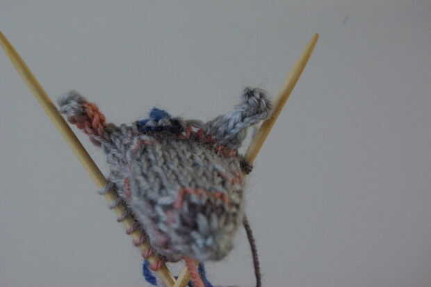 Del misma partida punto tomar 7 sts en la dirección opuesta y poner en la aguja 2 utilizando el mismo método de quitar el hilado inútil. El sts 2 de aguja no se utilizan todavía. Quite las 3 siguiente sts de la misma manera y los de aguja 3. Tejer otro oído como se describe antes.
