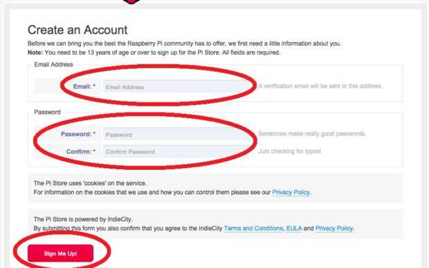 Introduzca su dirección de correo electrónico y una contraseña. Haga clic en el botón de Sign Me Up!]. Será iniciar sesión en tienda Pi.
