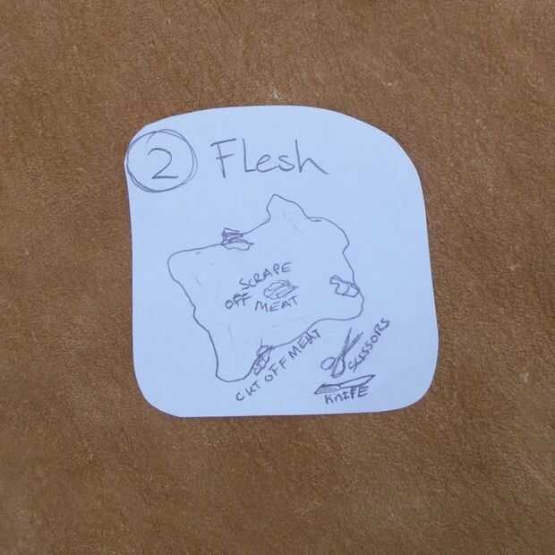 La primera cosa a hacer es raspar o cortar (el que sea más fácil) cualquier carne que ha quedado en la piel después de pelar y disponer de él. Descarne, granulación, y enjuague, hago un punto de guantes de cuero encima guantes de goma para proteger completamente a mis manos. Ocultar el bronceado es peligroso en que incluso un pequeño corte puede conseguir intoxicación de la sangre si usted trabaja con las manos desnudas. A la larga es solo más seguro usar una capa protectora, especialmente sobre heridas abiertas, incluso un corte de papel.