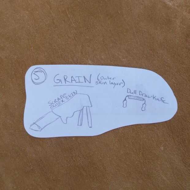 Para una piel del grano, la mejor herramienta es un aburrido drawknife. Para ser más tradicionales, un pedazo de madera con un borde afilado, un hueso con un borde afilado, o una roca con un filo moderadamente también conseguirá el trabajo hecho. El objetivo es raspar la capa externa de la piel sin dañar las capas, el cuchillo de dibujo debería ser sólo lo suficientemente aburrido como para que si uno ejecuta el dedo sobre la hoja, no creará un corte. Use el sentido común, si usted prueba una hoja de esta manera, asegurarse de que realmente es aburrido primero.
