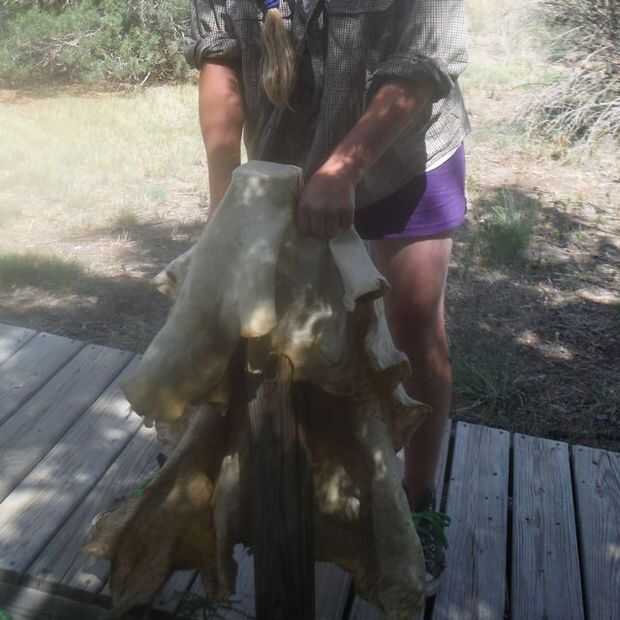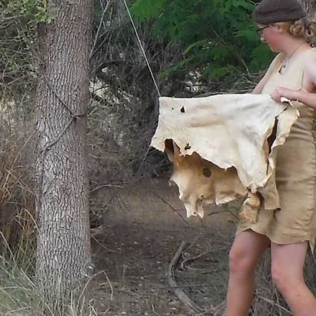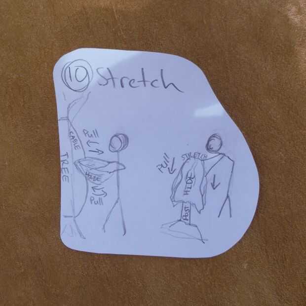 Ablandamiento no es difícil, sólo desperdiciador de tiempo. En esencia, ablandamiento continuamente es estirar la piel hasta que seque. Si no se estira, la piel se endurecerá al cuero. Los dos métodos que he utilizado están estirando el cuero sobre un poste que se ha fijado verticalmente en el suelo en aproximadamente a la altura de la cintura, o estirar un cuero a través de un cable metálico de entre un cuarto y un octavo de pulgada de diámetro colgado de la altura de la cabeza al suelo. Ambos permiten el uso del peso del cuerpo para estirar la piel en comparación con sólo sentarse y tratar de estirar la piel con las manos solas, que está muy bien, pero sólo para aquellos con manos fuertes.