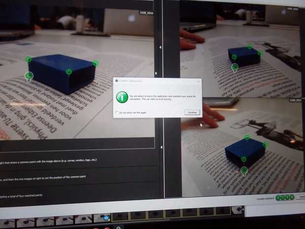 En la aplicación de captura 123D puede manualmente stich fotos que no son reconocidas correctamente. Por la presente usted conectar puntos que son los mismos en diferentes fotos. Después puede eliminar el fondo y asegúrese de que tener sólo el objeto que desea editar izquierda.
