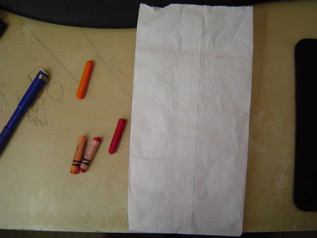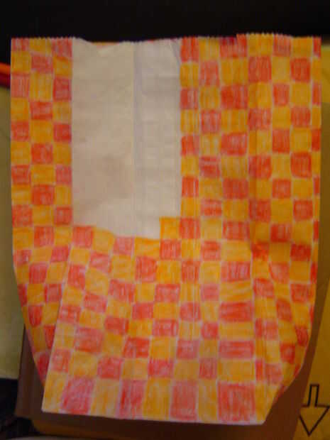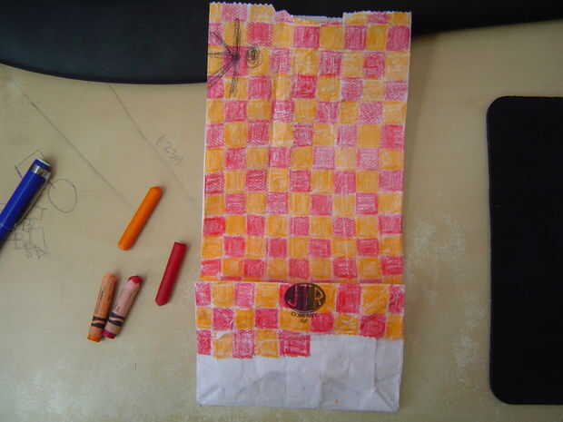 Parece algo muy fácil de trabajar como el lienzo de dibujo, pero esto es basura real que fue dejado sobre una mesa en un restaurante al aire libre en San Francisco. Uno de mis amigos dejados allí después de que terminó su bolsa de cookies, por lo que solo agarraron después de encontrar un par de lápices de colores, naranja y rojos y comenzó hacer un cuadrado en la bolsa.