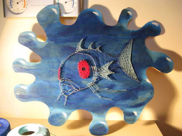 Ya que yo estaba haciendo un pez, decidí que quería a una especie de chapoteo detrás de él. Un patrón de salpicaduras a mano alzada se basó en la madera y cortar con una sierra de calar, luego había pintado con acrílicos. Si pones en una capa delgada de pintura acrílica, la veta de la madera a través de un poco y da efectos acuosas muy bien. Lo que, tener en cuenta que usted será clavado decenas de diminutos clavos en ella.