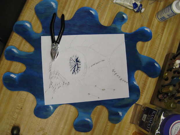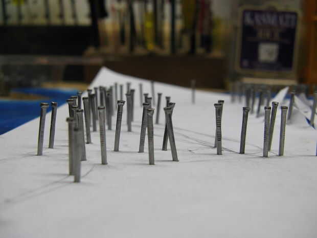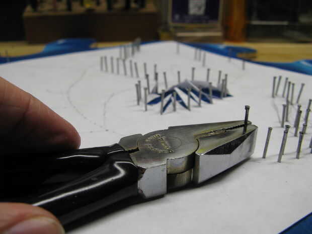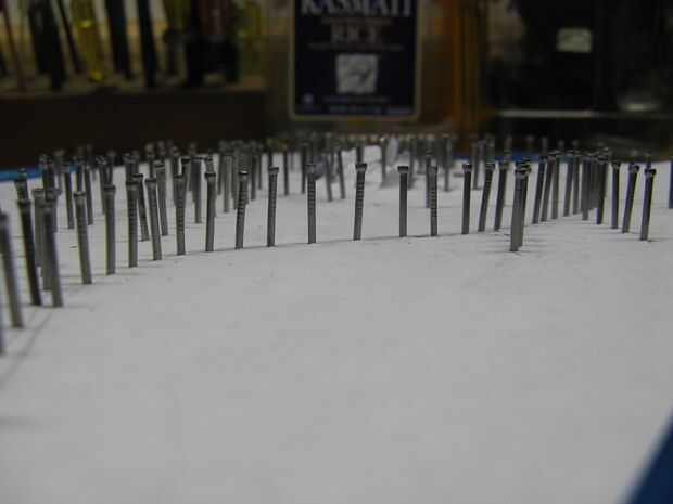 Decide donde quieres tu diseño, pegar una impresión o copia de la misma en el tablero y empezar a clavar.  Los primeros docena clavos pocos lo hice a mano y tomó para siempre - incluso peor, eran irregulares.  Entonces descubrí que podía usar un grueso par de pinzas para sostener cada clavo firmemente y verticalmente.  Como un bono, el ancho de la pinza puede ser la altura del clavo estándar - stop sólo martilleo de una vez te en contacto con ellos!