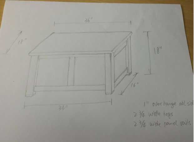 El banco va a ser una simple caja con la tapa abierta, y la parte superior de la tapa es la zona de estar. Nos gustaría tener el maximizar el almacenamiento, por lo que la caja está diseñada sólo 2" fuera de la planta. La altura final será de 18 1/4"(18" es una típica altura de banco o silla).