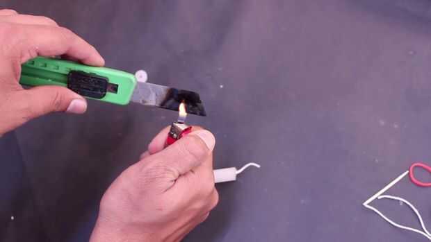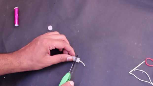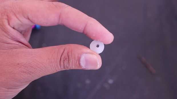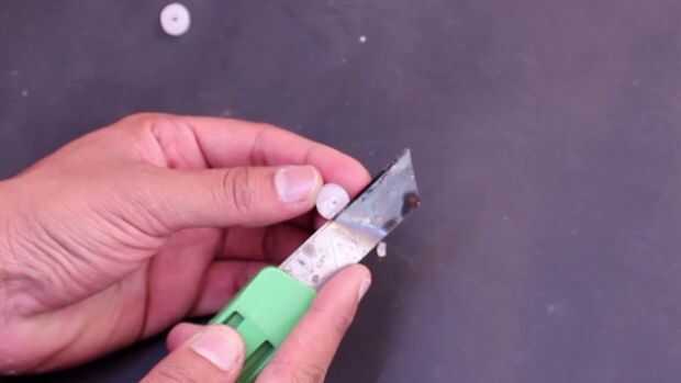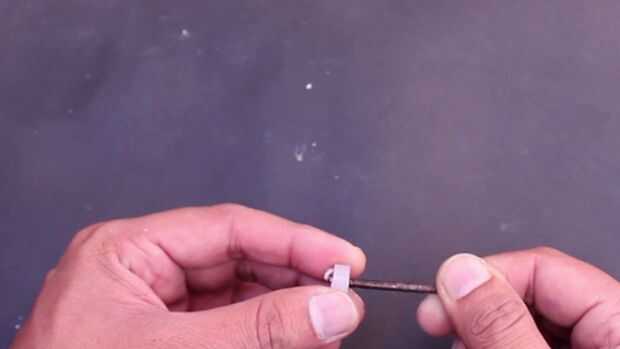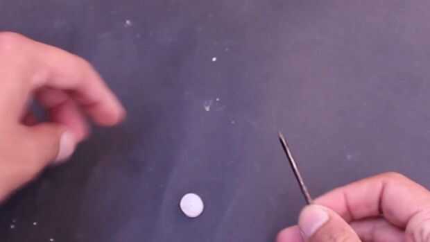 Utilizando hoja flameada cortar un pedazo pequeño de vela y suavizar los dos lados, luego utilizando un clavo flameado perforar un agujero en el centro de vela pieza como se muestra en la imagen