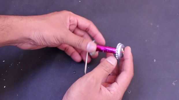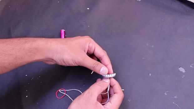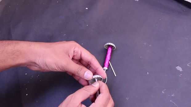 2 por sostener dos extremos del hilo de pasar la goma en el agujero de la tapa de la botella y coloque un pedazo de foto de dientes para sujetar la goma en un extremo