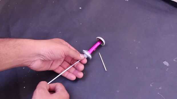 3 pasar el hilo de rosca con banda de goma por el rollo de papel y luego en la segunda tapa de la botella.