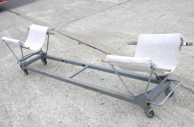 Soldado con autógena algunas sillas de boca abajo a los extremos del marco, agregó alfombra eslingas y soldadura de ruedas en la parte inferior del marco de la.