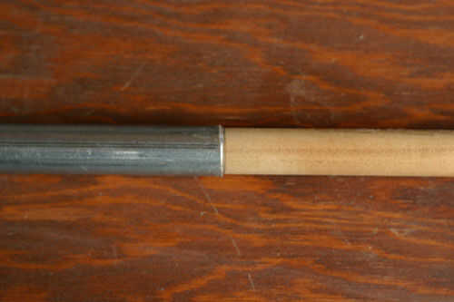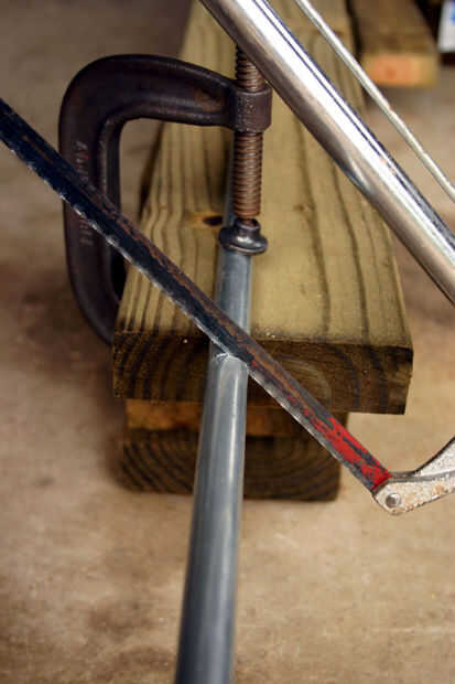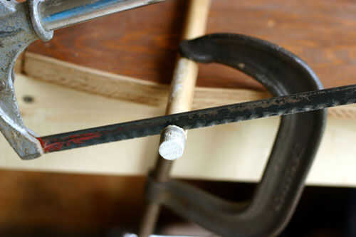 Ahora trata de girar la varilla de pasador de 5/8 de pulgada en el conducto. Probablemente será un poco apretado, que tal vez necesite lijar sólo un poco. No trate de usar taquetes de 1/2 pulgada o será demasiado floja. Una vez que tenga un buen ajuste, fijarlo con la abrazadera y serrar dos esbozos poco 1/2 pulgada. Estas se utilizarán para unir los remates para el conducto.