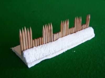 Corte un rectángulo de la base de la espuma mide 17 cm por 3 cm y que detrás de la pieza de espuma de goma. Ahora toma tus pinchos de barbacoa y 23 cortar a la longitud de 4.5cm y afilar las puntas de ellos. Reducir otro 20 con una longitud de 2cm, pero don? t afilar las puntas de éstas. Una vez que se han cortado el pegamento estupendo ellos juntos en el tablero en filas de 5 hasta llegar al final, que yo solo necesitan 3.
