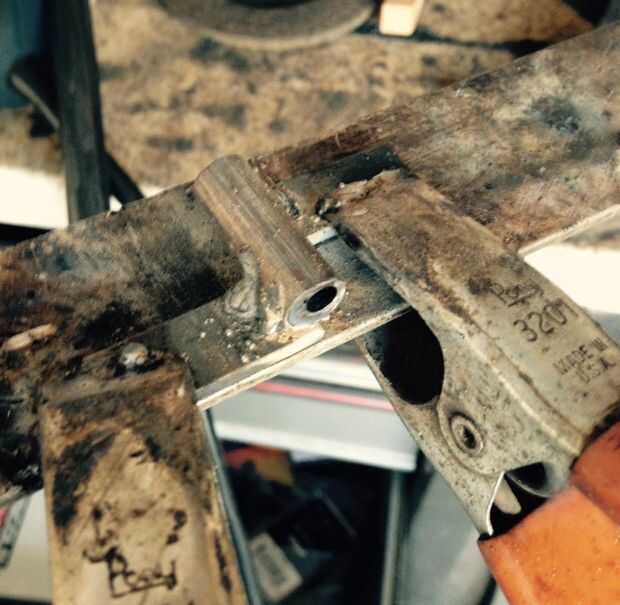 Utilicé una pieza de 1 1/2 x 1 1/2 de pulgada de ángulo de aluminio para sostener y colocar pedazos de hoja para la soldadura de la barra de cuerpo bisagra de 3/8 de pulgada. Al final de la hoja a la izquierda en la foto se coloca 3/16 de pulgada, o la mitad del diámetro de la varilla de 3/8 de pulgada por encima de la parte inferior de la esquina interna. La otra pieza de la hoja actúa como un espaciador para la instalación de soldadura. Ver la segunda foto.