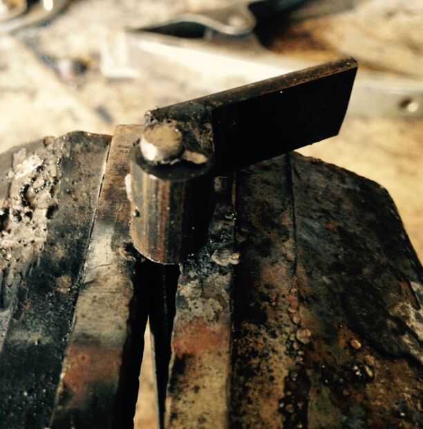 Deje aproximadamente 1/8 de pulgada de pasador de la bisagra se extienden más allá de la parte inferior del cuerpo. Soldar en su lugar. Deslice la otra mitad de la bisagra en el pasador de la bisagra. Cortar la bisagra y alrededor del borde superior de la bisagra.